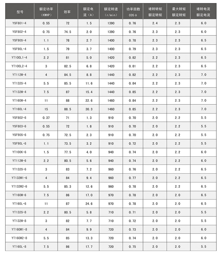 YT系列風(fēng)機(jī)專用三相異步電動機(jī)是根據(jù)風(fēng)機(jī)行業(yè)的配套要求,電動機(jī)在結(jié)構(gòu)上采取了一系列的降噪、減振措施。該系列電機(jī)具有高效節(jié)能、噪聲低、振動小、起動性能好、運(yùn)行可靠、使用安裝方便等特點(diǎn)。額定電壓380V、頻率50HZ,也可按用戶要求制成其它電壓及頻率。防護(hù)等級為IP44,絕緣等級為B級,也可制為F級,工作方式為S1。 該系列電機(jī)結(jié)構(gòu)簡單合理,安裝方式好,適用于風(fēng)機(jī)安裝和使用,是風(fēng)機(jī)的理想配套產(chǎn)品。